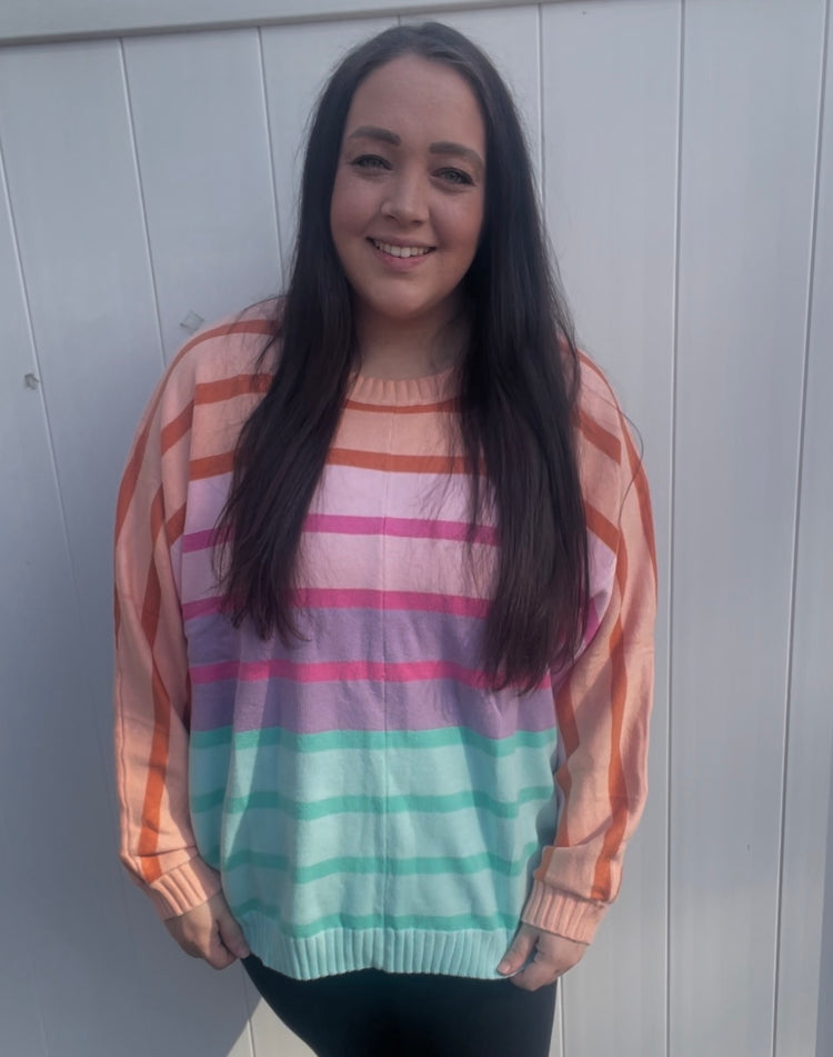 Add a pop of fun to your wardrobe with our Pastel Striped Colorblock Sweater. Vibrant colors and a playful striped colorblock design make this sweater perfect for cool spring days. Bring some personality to your outfits with this quirky and stylish sweater.
