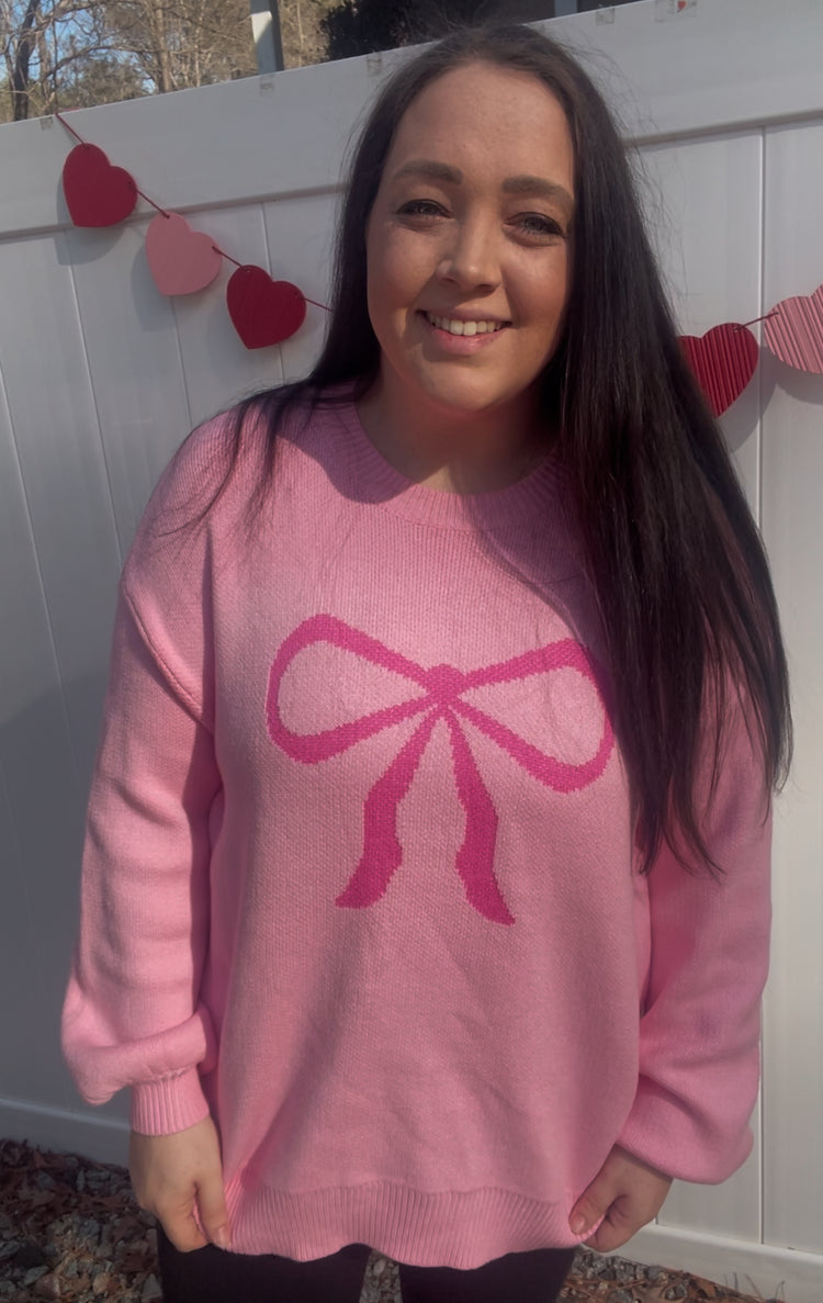 This soft, trendy sweater will have you looking lovely on Valentine's Day with its cute pink bow design. Perfect for adding a touch of sweet charm to any outfit. Don't miss out on this must-have piece!