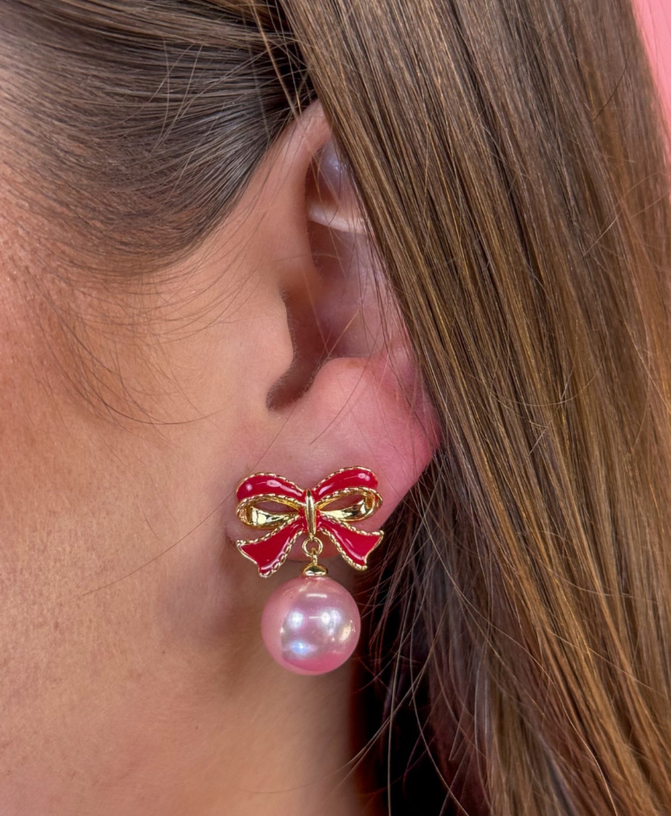 The Festive Bow Drop Earrings feature a pink enamel stud topped with a gold bow, finished with a playful dangling pink pearl. Perfect for adding a fun and chic touch to your holiday style!